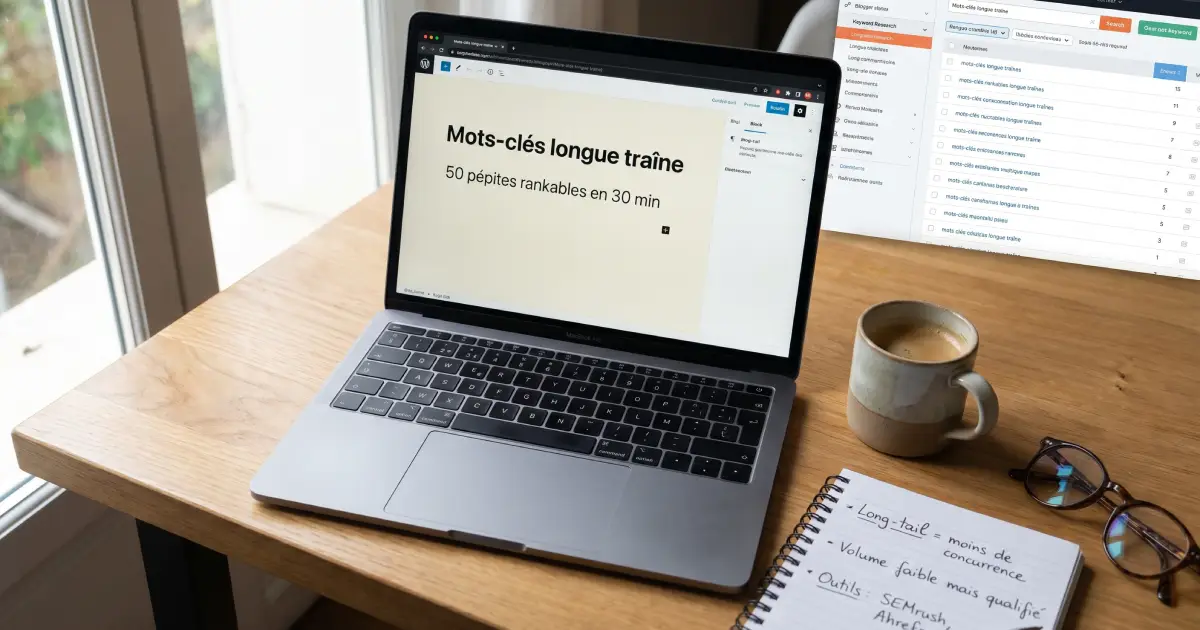 Cet article te donne la méthode que Camille a retenue : les 3 seuils chiffrés pour qualifier un mot-clé longue traîne, les 5 outils à utiliser (dont 3 gratuits), un déroulé réel de 30 minutes et les erreurs qui plombent 80 % des listes.